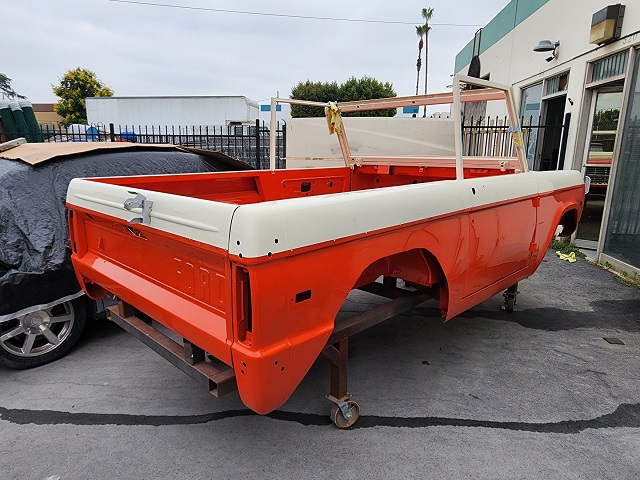 ストロップブロンコのペイントスキームに則り、ウィンブルドンホワイトとポッピーレッドで塗分けられた、1972 Stroppe Bronco “501” 号のボディです。