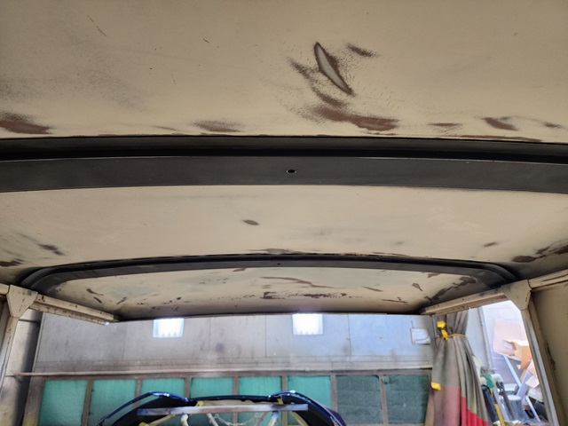 古いペイントの剥離作業及び傷んでいる部分のリペア作業を行っている1972 Stroppe Bronco “501” 号のハードトップです。