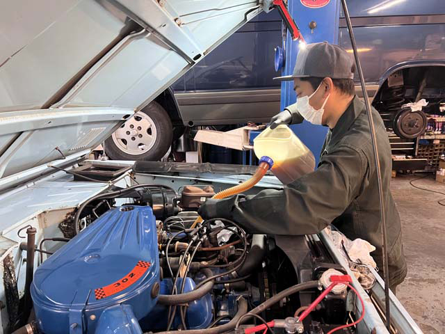その後、フレッシュなエンジンオイルをエンジンへと入れ、規定量に調整して作業完了です。