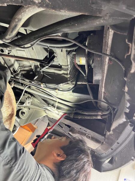 VANAGONをリフトで持ち上げて、下まわりのチェックを行っています。消耗品など交換が必要なパーツのリストアップを行いながら、下まわりの状態を確認中。