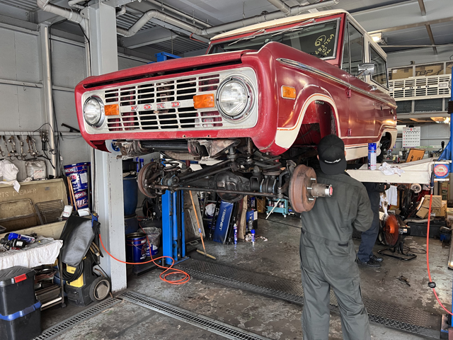 マフラー交換を終えた1973 Bronco Ranger、日本へ向けてのシッピング前に近所のメカニカルショップへと持ち込まれました。