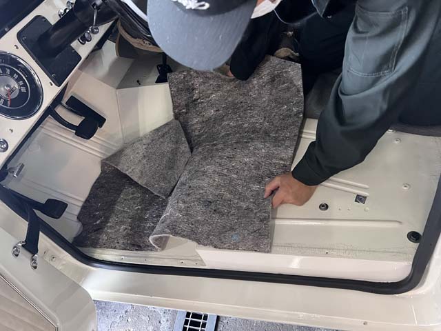 フロアにカーペットを敷く前に、エンジンルームの熱が伝わってきやすいフロントシートの脚元に断熱材を入れ込みます。