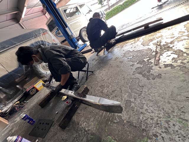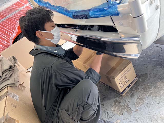 磨きが完了したバンパーを早速取り付け。まずはリアバンパーから。
