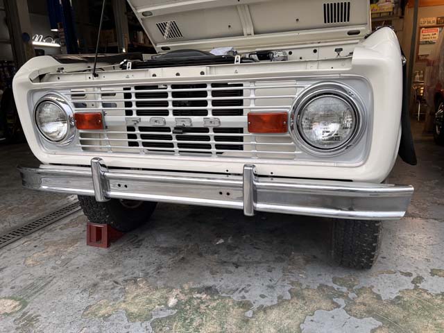 そしてフロントバンパー。バンパレットも取り付けました。灯火類を取り付けた時もそうですが、バンパーを付けることによってBroncoの表情が変わりますね。