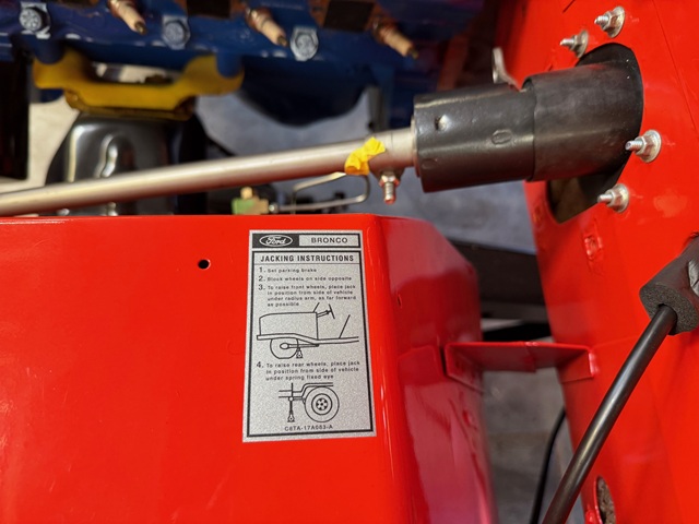 ドライバーサイドのホイールウェル上には、ブロンコ用のジャッキインストラクションステッカーが貼り付けられました。このステッカー、実は復刻されていないのですが、このプロジェクト用にワンオフで製作してもらいました。あくまでもオリジナルの状態にレストアするという使命の元、細部にまでこだわっているのです。