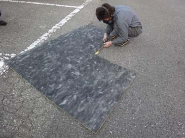 • アメリカから届いたインシュレーターは1枚の掛け布団のような状態なんです。これを取り付けるフードの大きさに合わせてカットしていきます。